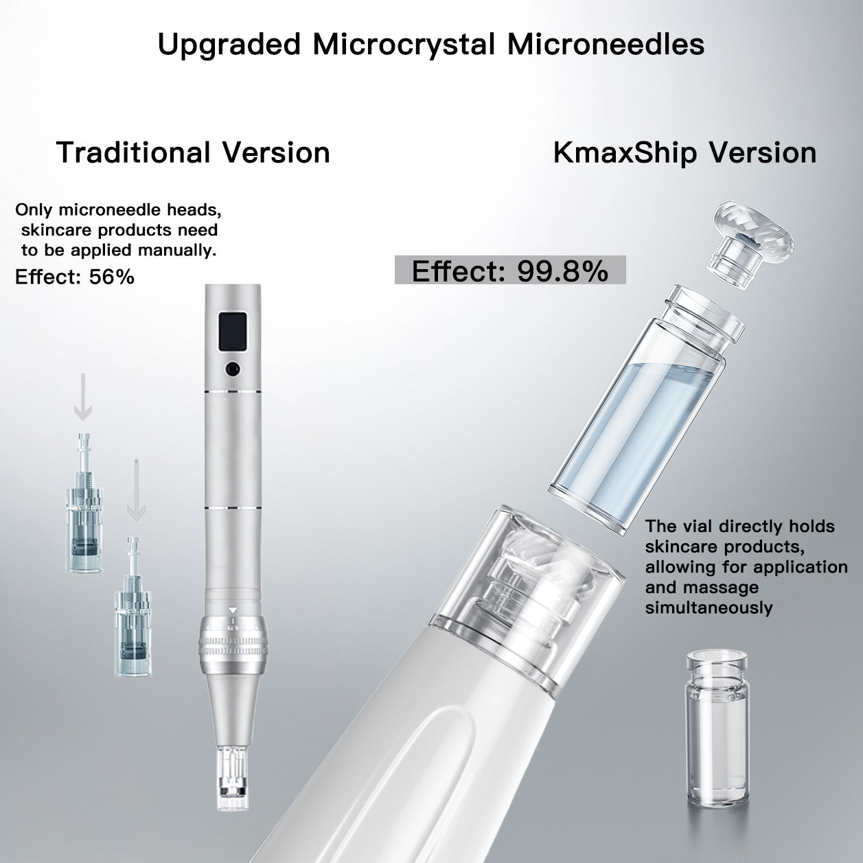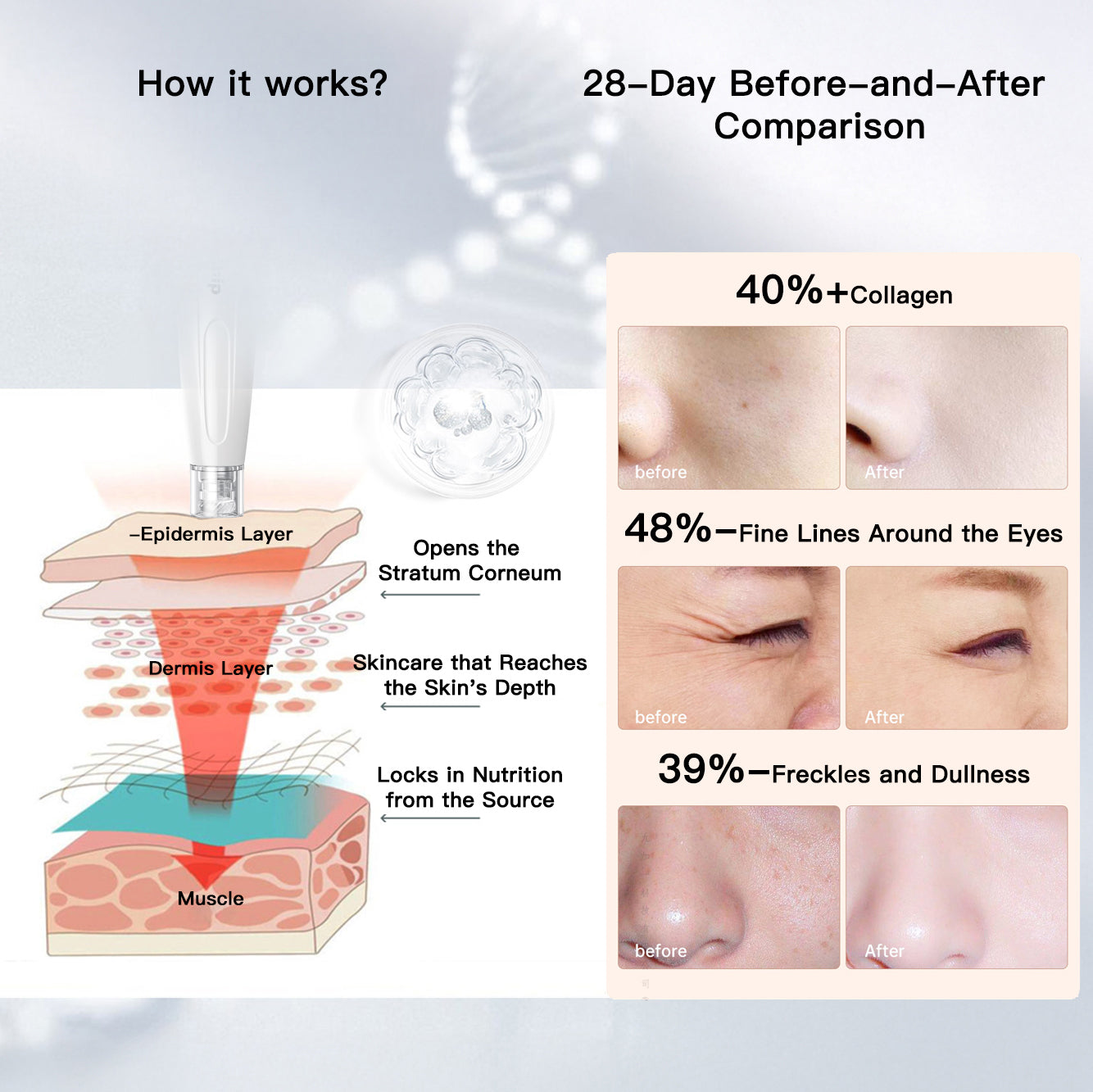 Our pen features upgraded microcrystalline micro needles that safely deliver skincare products to the basal skin layer without damage, plus an active injection system that pushes products deep into the skin for 300% better absorption than traditional topical application.
